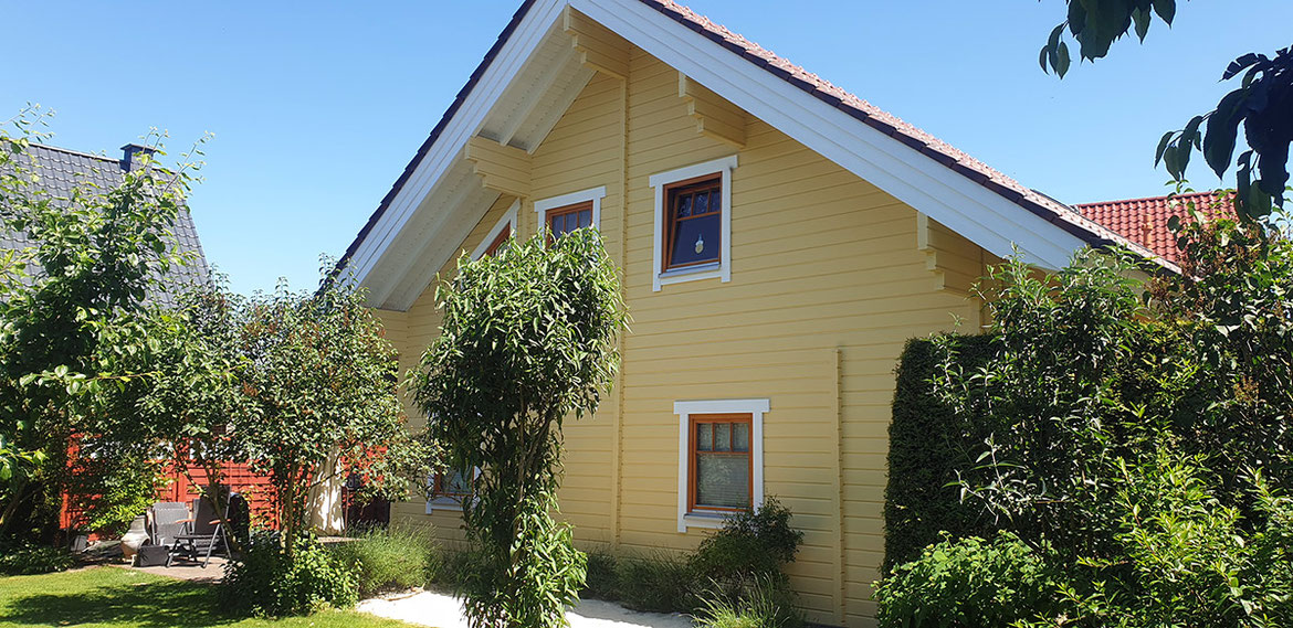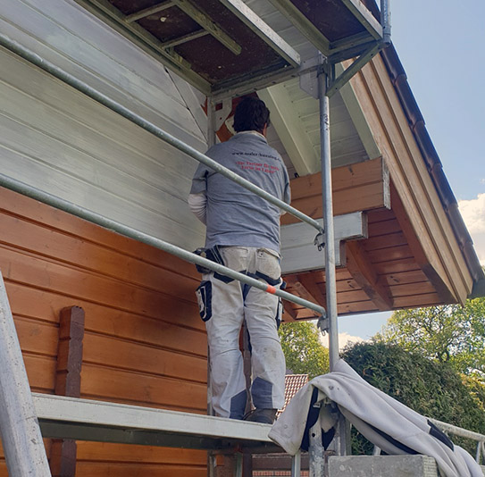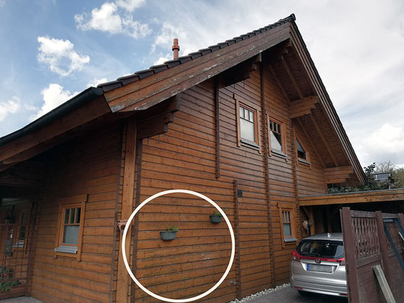 Im September 2019 wurde unser Malerbetrieb von einer jungen Familie aus dem westlichen Münsterland mit dem Anliegen einer Renovierung eines Giebels und den Windfedern ihres Holzblockhauses kontaktiert.