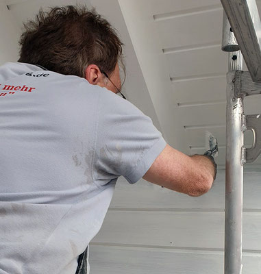 Anscheinend waren die Eheleute von der Ausarbeitung und auch der Ehrlichkeit des Angebotes so begeistert, dass wir nochmals einen Termin vor Ort machten, an dem auch Herr Dierkes teilnahm. Wir stellten uns den Fragen des Kunden und schlugen den beiden vor, vom lasierten Anstrich ganz weg zu gehen und zu einem deckenden Anstich zu wechseln.