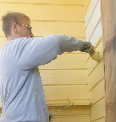 Dieser Anstrich nahm sehr viel Zeit in Anspruch, bis wir schließlich mit dem zweimaligen Endanstrich beginnen konnten. (Endbeschichtung Dachuntersichten und Leibungsbretter: „Jotun Demidekk Helmatt“ im Farbton 1001 (0502-Y) matt. Fassade: „Jotun Demidekk Helmatt“ im Farbton 1456 (1126-Y12R) „Demigul“ matt.)
