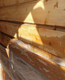 Ein Zwischenschliff der rohen Holzstellen war nach der Trocknung des Holzes nötigt, da sich die Holzfasern der Balken durch die Feuchtigkeit aufgestellt hatten.