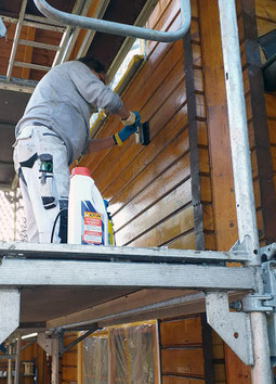 Die Fotos, die mir der Kunde mitgeschickt hatte, ließen mich stutzig werden. Man konnte erkennen, dass sich der vorhandene Anstrich von der Fassade abschälte. Dieser Zustand ist bei vielen Lasuranstrichen selten. Ich machte mit dem Kunden am Objekt einen Termin, um mir das Schadensbild genauer anzusehen.