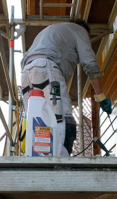 Wir wunderten uns schon, dass bei den Prüfungen doch immer wieder scheinbar intakte Anstriche entfernt werden mussten. Danach haben wir sämtliche Flächen mit „Jotun Kraftvask“ angelaugt, durchgebürstet und dann die Flächen mit klarem Wasser nachgewaschen.