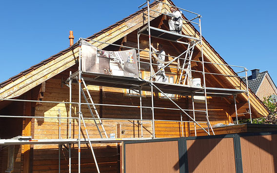 Um die Arbeiten fachgerecht und auch arbeitsschutzrechtlich vernünftig durchführen zu können, wurde das Haus zunächst von Malerbetrieb Hüning eingerüstet.